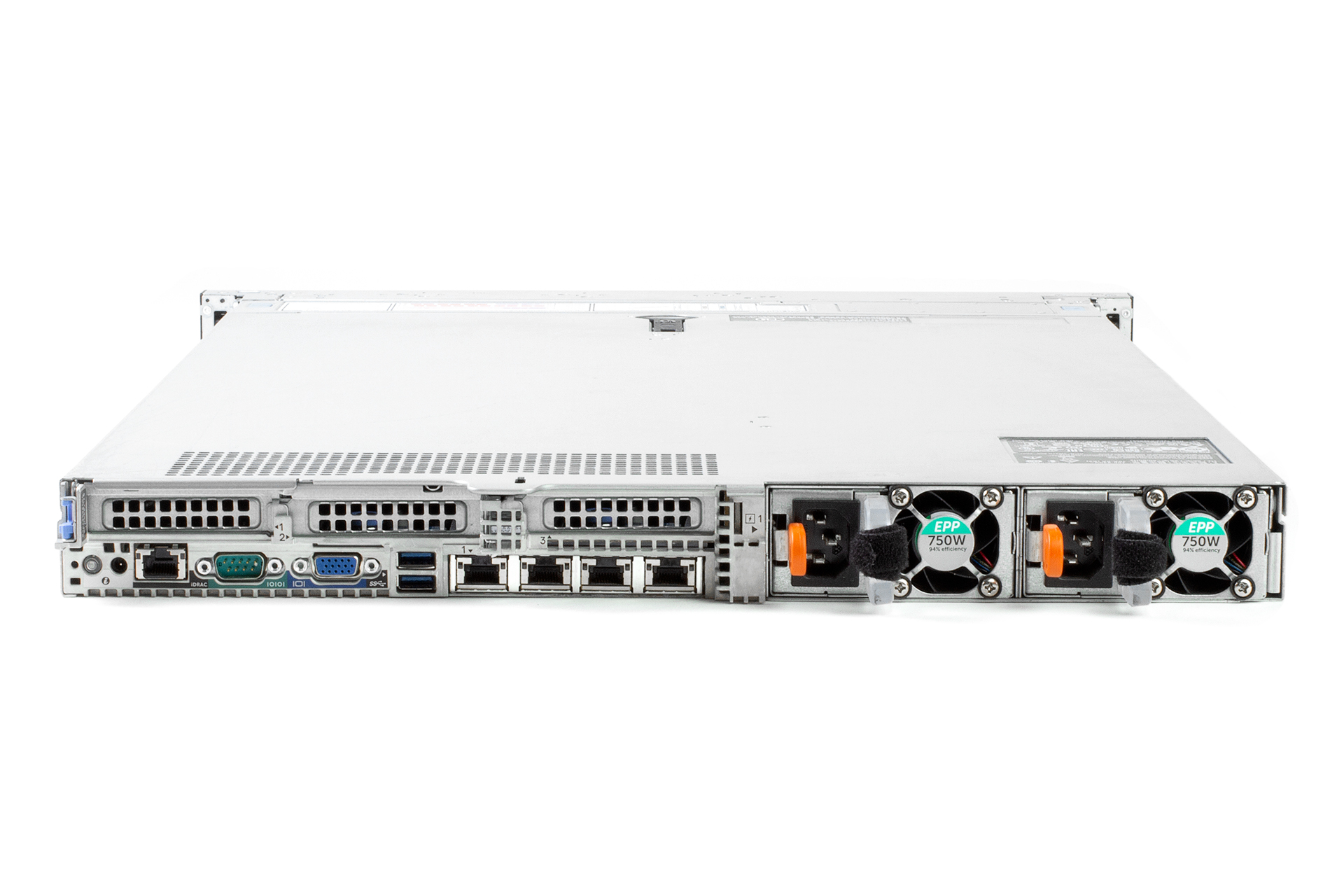 Zadní porty: 1× vyhrazený síťový port iDRAC, 1× sériový port, 1× port USB 3.0, 1× port VGA