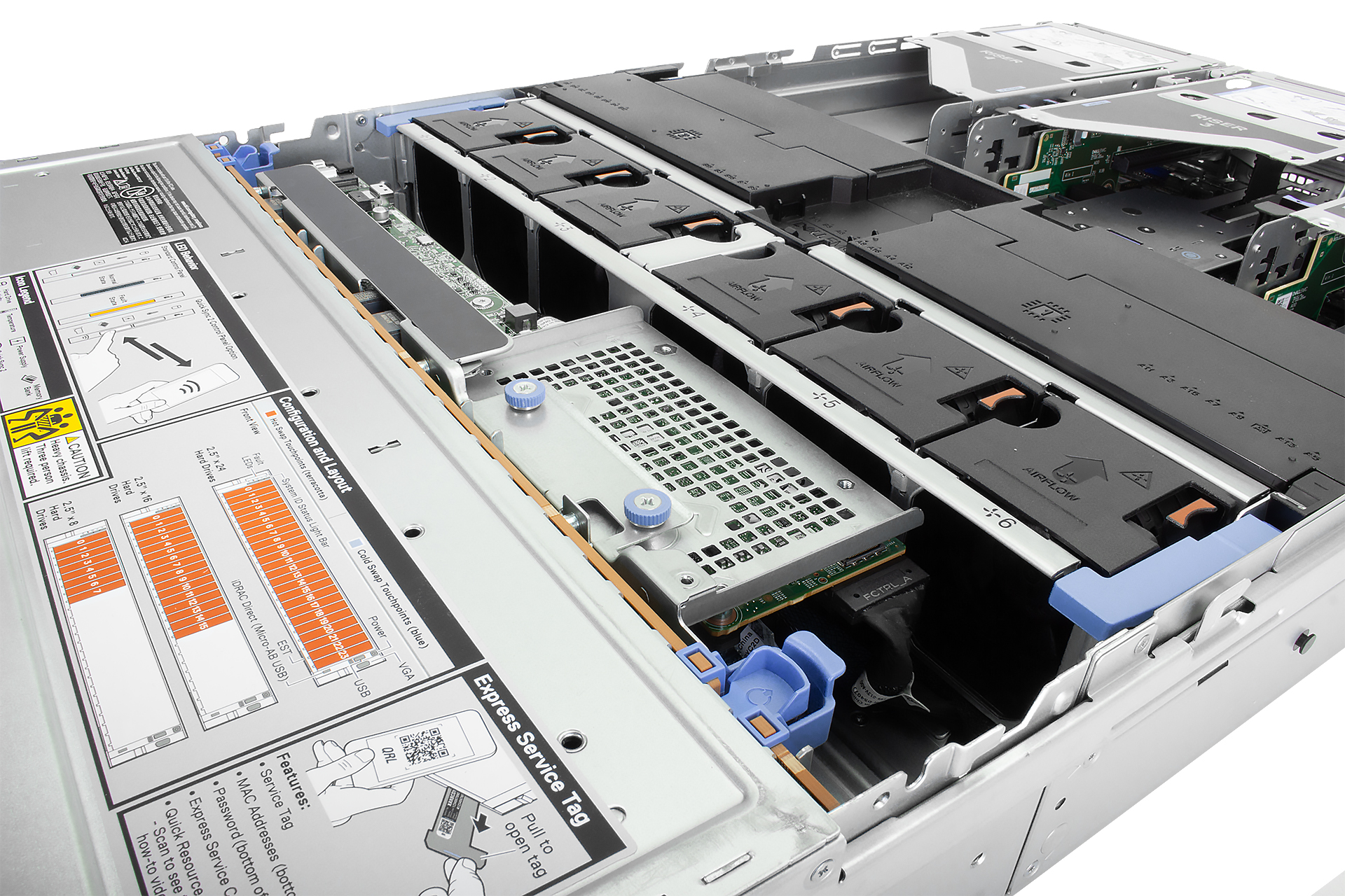Přední disková backplane má celkem 24 pozic pro disky 2.5", je možné osadit max. 16 disků s rozhraním SAS/SATA a 8 disků NVMe formátu U.2